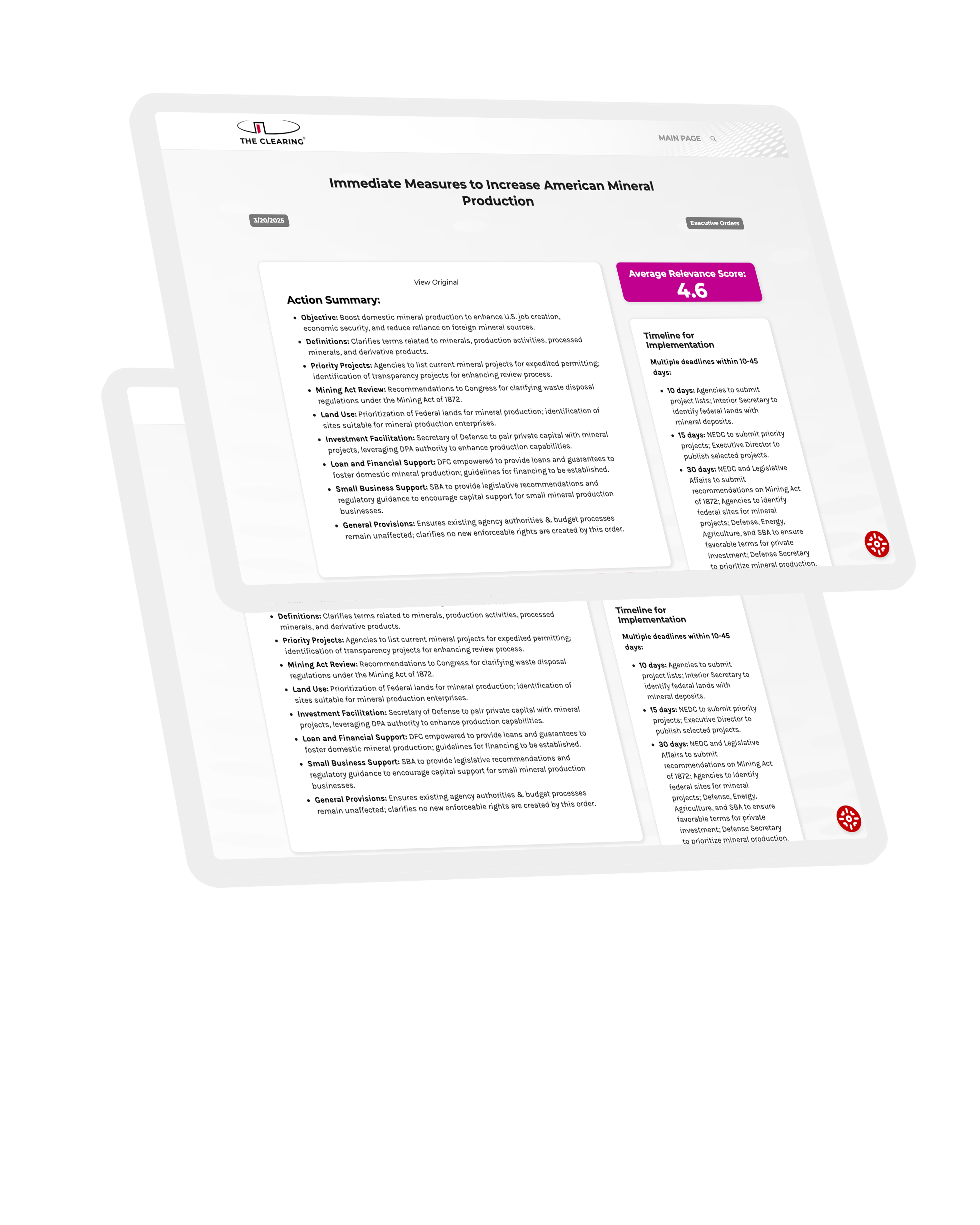 GovPulse™ generates reports on every Presidential Action and categorizes them by relevance—from benign to critical—allowing leaders to focus on what matters most and align actions with evolving government mandates. Reports are published in a secure portal, allowing leaders to review them without sorting through a sea of information.